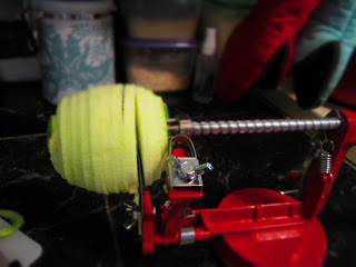 When making apple pie I usually stick to my mom's recipe. But I was in the mood for something that took a little less time than making my own crust and was a little bit different. I found a recipe for an apple crumb pie made with an almond crumb crust by Martha Stewart. Yummy! This pie is delicious! The crust is almondy and crispy, while the apples are warm and tart. I even got to use my new apple peeler. Trust me, if you don't have one of these and you use apples a lot in cooking then you need to get one. They will make your life so much easier, especially around this time of year.