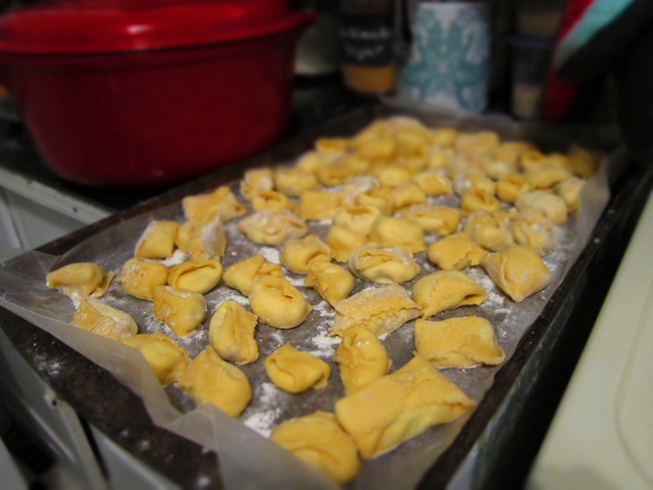 2) Have pasta rolled out into 4-inch squares and the place a small amount of filling into the pasta and shape into tortellini. You will have to practice this a few times before you get it right.
