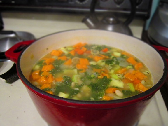 1) In a dutch oven saute the onion, celery, carrots, and garlic until onion is translucent, then add the chicken stock, sweet potatoes, white beans, seasonings, and kale