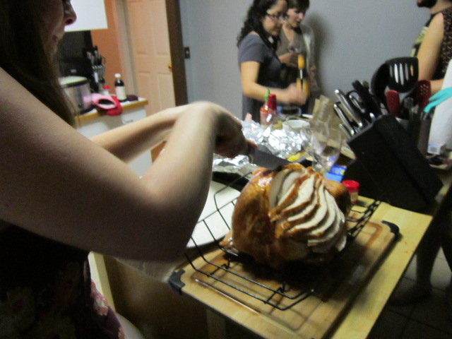 People began to flow into the kitchen and once those sides were done I was presented with another daunting task. Carving the turkey. I had quickly looked up how to do so and followed some pretty basic directions. I could do with a little practice, but all in all I did a fairly good job with the carving. As I was carving I was astonished at how moist the turkey was! I couldn't believe it. All of that worrying for nothing.